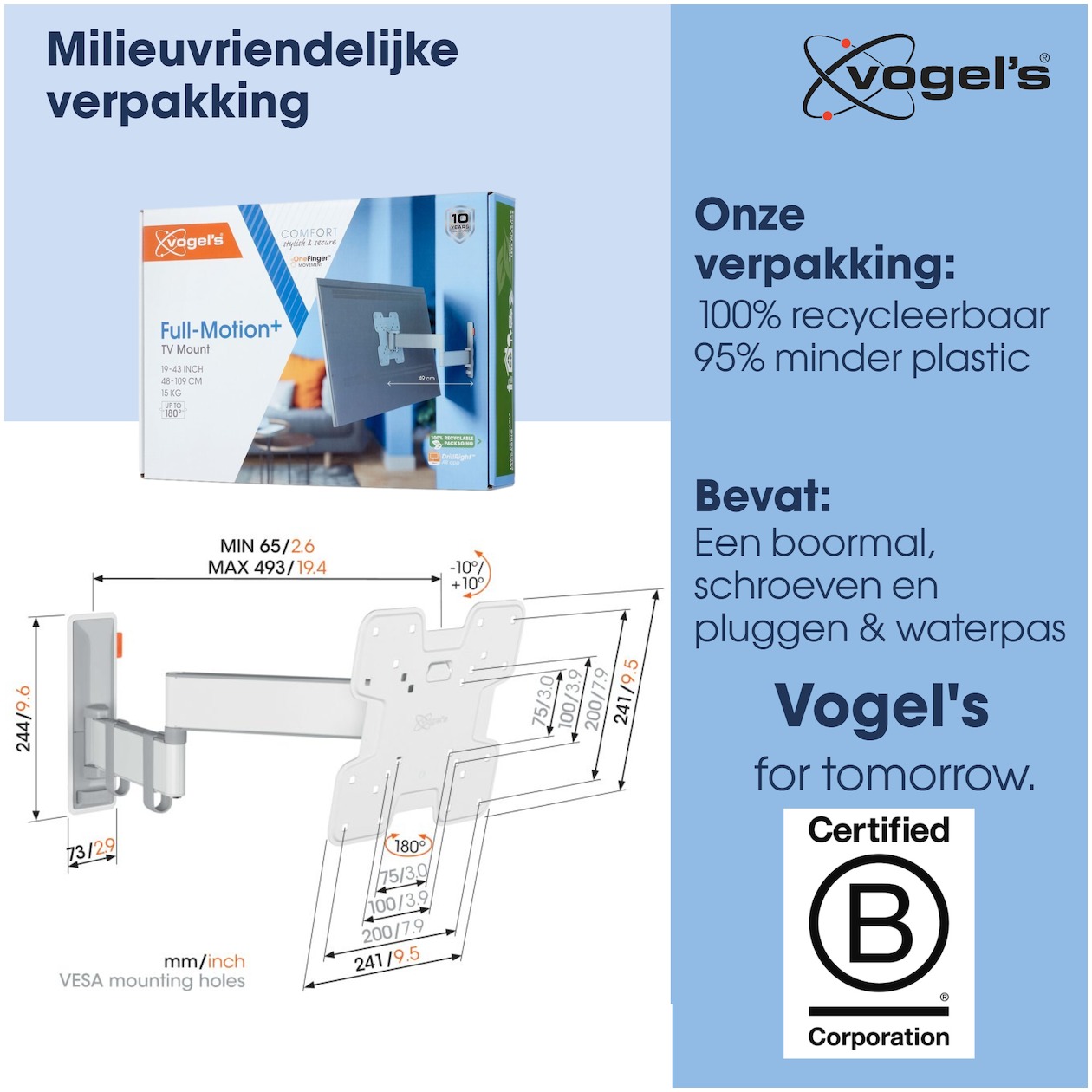 De COMFORT Full-Motion+ tv beugel van Vogel's staat voor design, veiligheid en enorm kijkcomfort. Je kunt de beugel tot maar liefst 180° draaien en tot 20° kantelen. Hierdoor geniet je moeiteloos vanaf elke plek in de kamer van je tv. De beugel is geschikt voor tv's van 19 tot 43 inch met een gewicht van maximaal 15 kg. De ideale kijkhoek stel je in met één vinger. Dankzij het One-Finger™ Movement systeem draait de beugel licht en soepel. Installeren is makkelijk. Bovendien zorgt Vogel's voor de nodige hulp. Een boormal, schroeven, fischer® DuoPower pluggen, waterpas en kabelbinders zijn bijvoorbeeld bijgesloten. En om je eerste boorgat eenvoudig te bepalen, gebruik je de gratis DrillRight™ AR App van Vogel's. Op deze Vogel's COMFORT Full-Motion+ tv beugel zit 10 jaar garantie. Ook als het gaat om veiligheid zit je met een Vogel's COMFORT Full-Motion+ tv beugel safe. De beugel is TÜV-gecertificeerd en getest op maar liefst driemaal het maximale gewicht. Zo hang je een tv - 19"- 43" - Draai- en kantelbaar - Draai je tv tot wel 180°